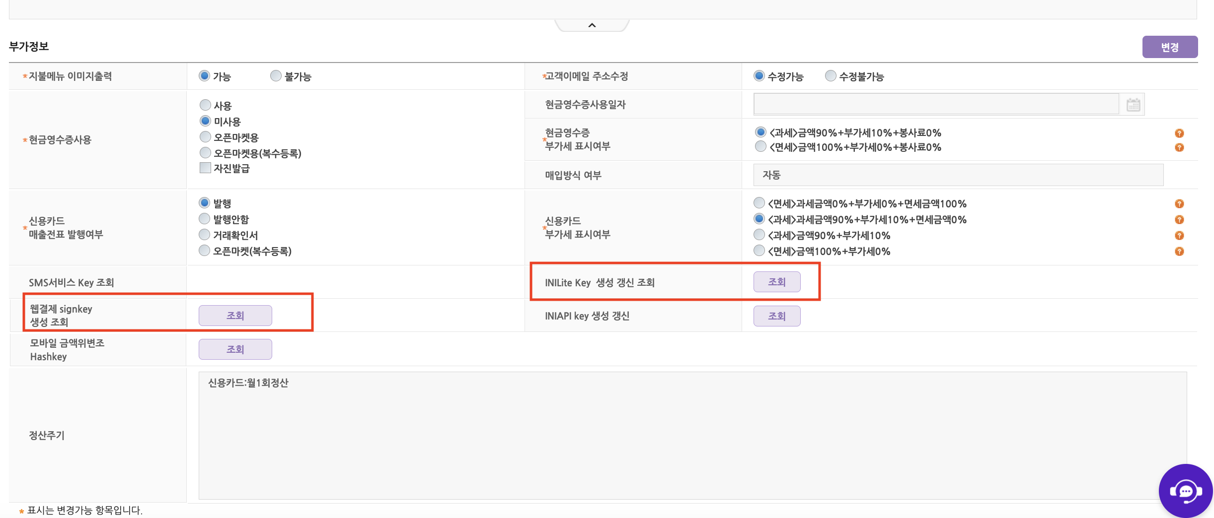 1. KG이니시스 화면(KG이니시스 상점관리자 > 로그인 > 상점정보 > 계약정보 > 부가정보)