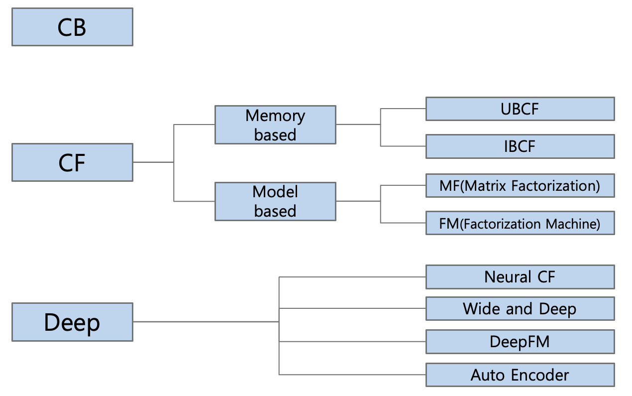 그럼, CF - CB - Deep으로 이어지는 추천 알고리즘을 하나하나 알아보자.