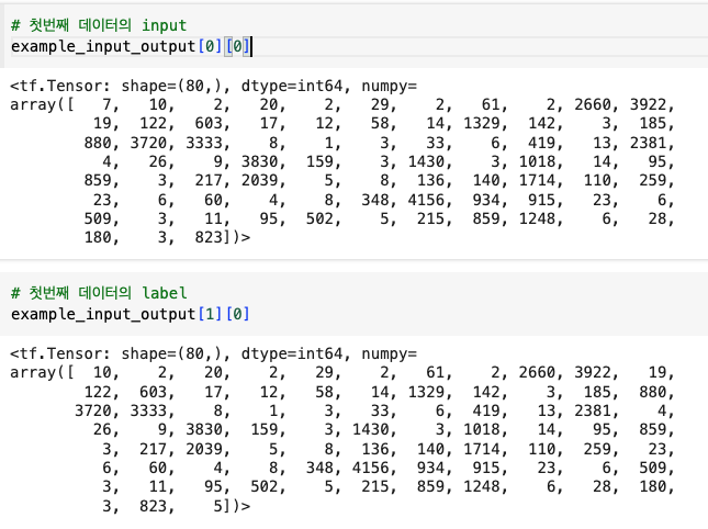 example_input_output = train_ds.take(1).get_single_element()- train_ds.take(1): train_ds한개를 가져오기 > 첫번째 배치(32개) 가져오기