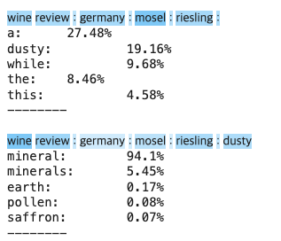 - 두번째는 다음에 등장할 단어 확률 상위5개( ':'가 germany다음에 올 확률 100%)