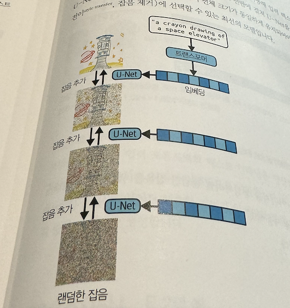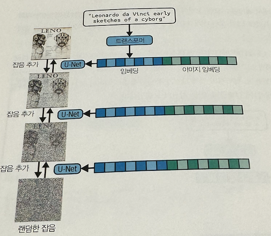 - 디퓨전 학습과 동일하게, 잡음을 찾아내는 신경망 학습 > 텍스트 임베딩에 매칭되는 이미지 임베딩을 잘 찾을수 있게 됨