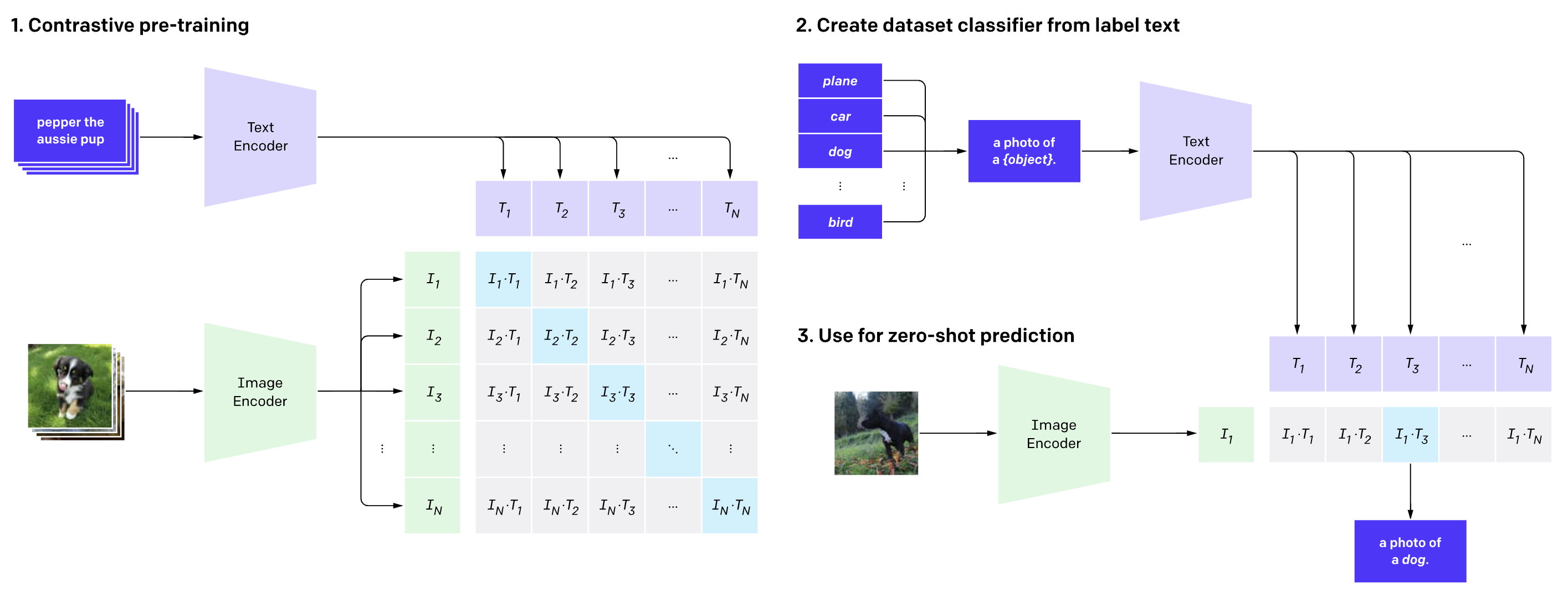 - CLIP은 입력으로 받은 텍스트/이미지를 각각 임베딩> 텍스트 4억개 벡터/이미지 4억개 벡터 > 코사인 매트릭스(유사도 매트릭스)