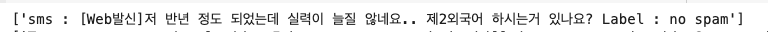 - 실제 첫번째 데이터를 출력해보면, 문자내용과 스팸여부를 알수 있음
