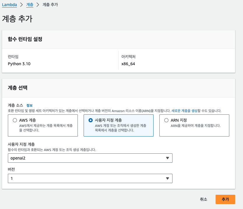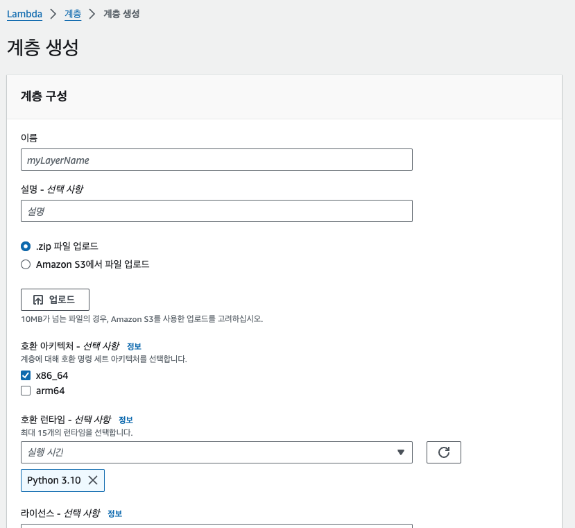 - lambda>계층>계층생성 들어가서 zip파일 업로드(나의 venv내용으로 lambda구성하는 개념)