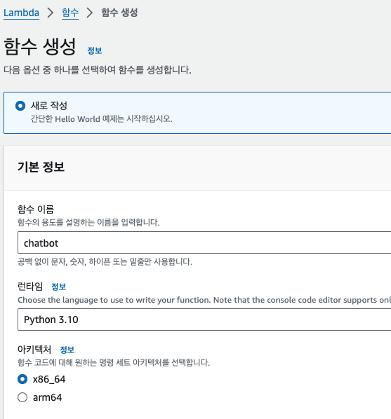 - 함수이름, 런타임, 아키텍처 설정 후 함수 생성