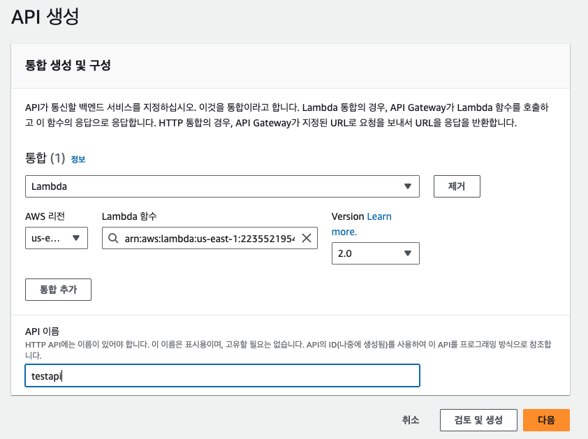 - 통합추가 클릭>Lambda선택>내가 만든 Lambda선택> 다음 클릭