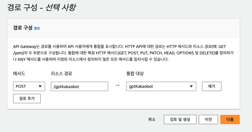 - 카카오톡에서 보내온 채팅메세지를 받아서 lambda에게 전달할 api gateway설정하자