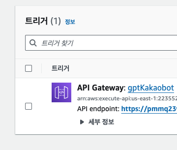 - 카카오톡 채팅방이 사용자의 입력을 보낼 api gateway 주소를 확인할 수 있다.