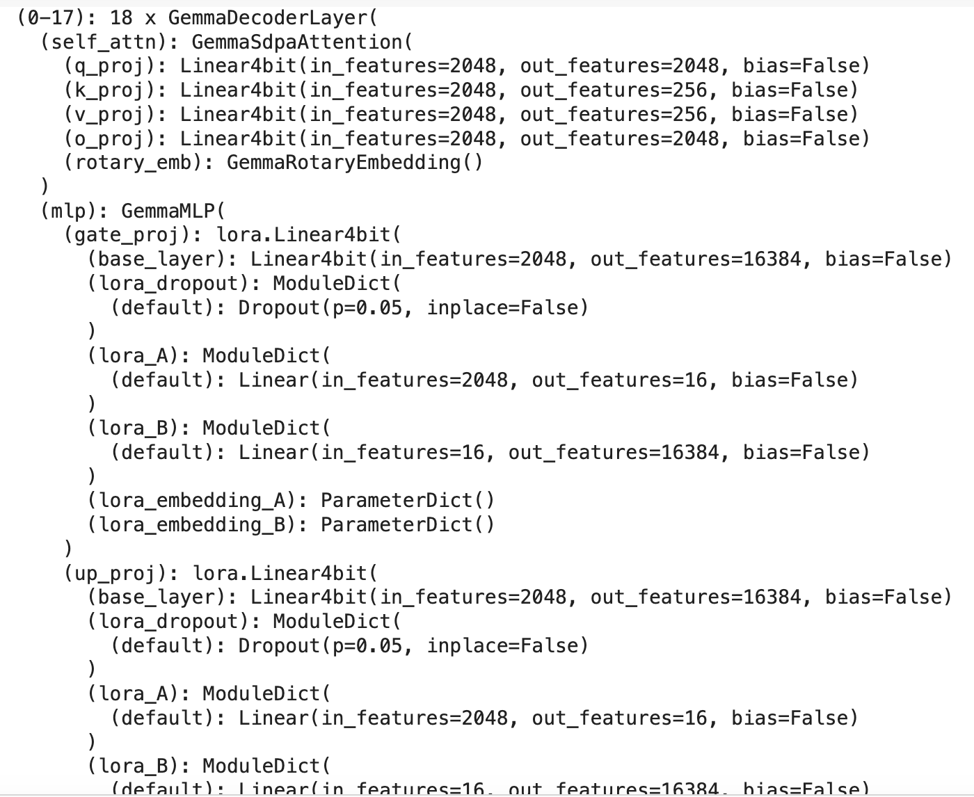 attention은 그대로이고, mlp의 gate, down, up에 LoRA가 붙은것을 볼수 있다.