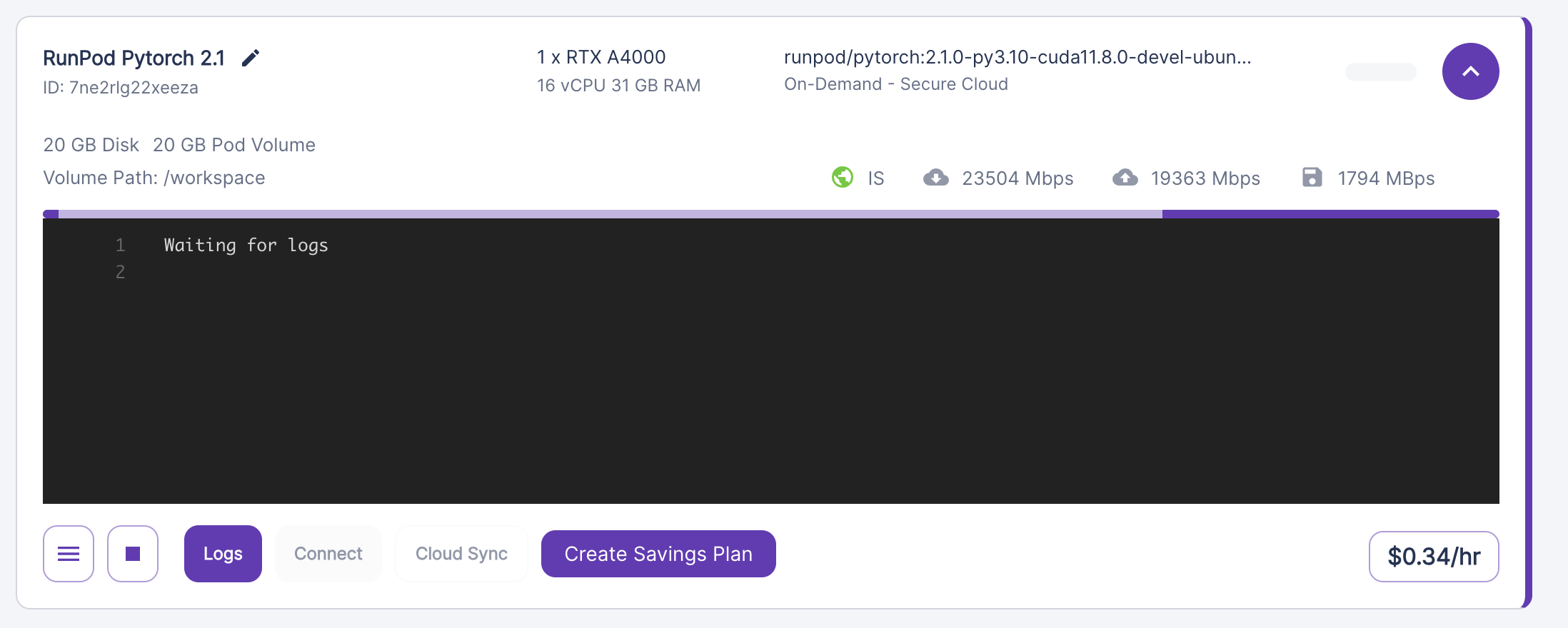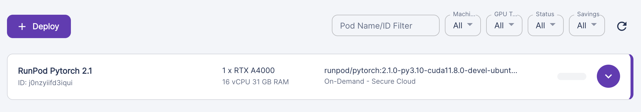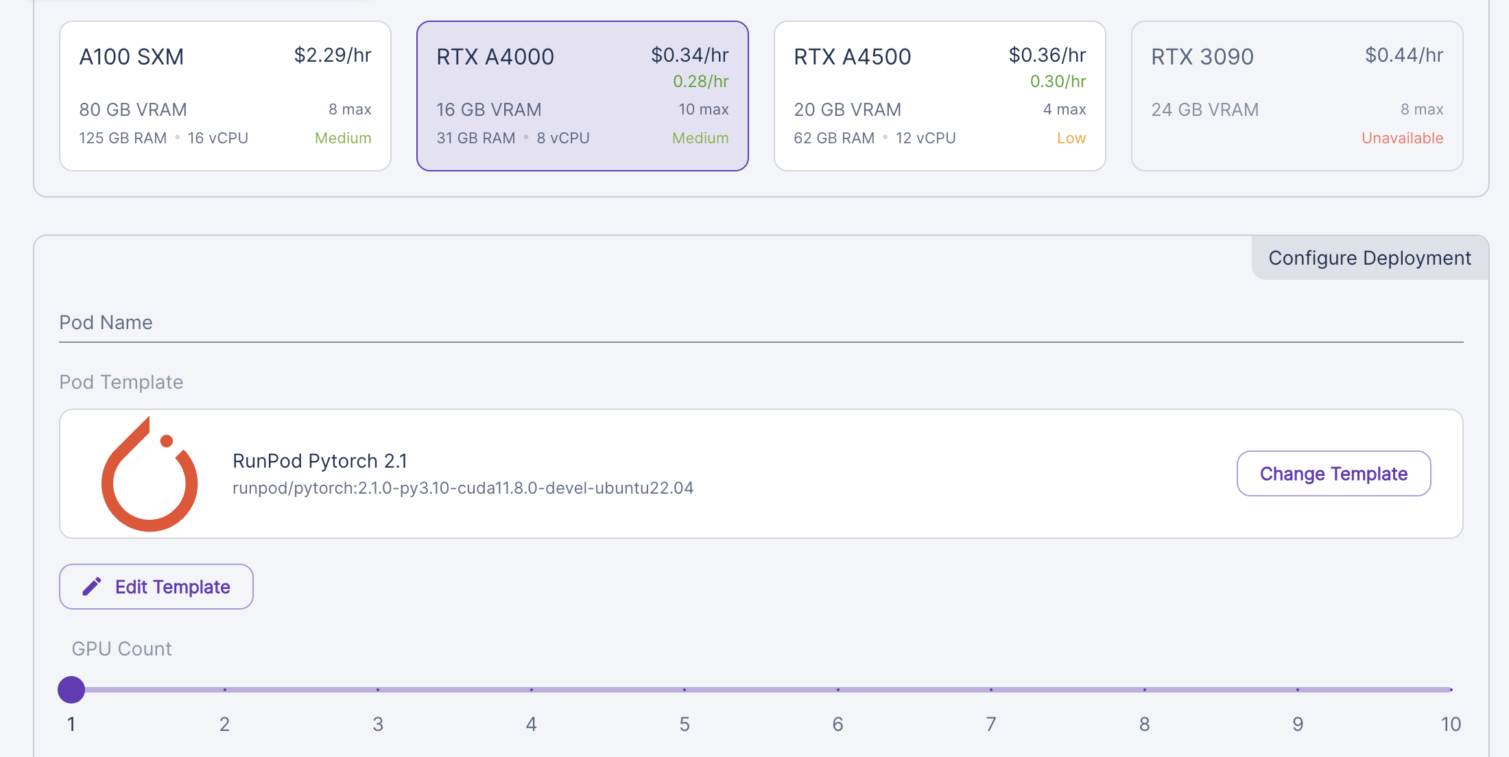 가장 싼 RTX A4000을 클릭, runpod pytorch그대로, GPU는 1개