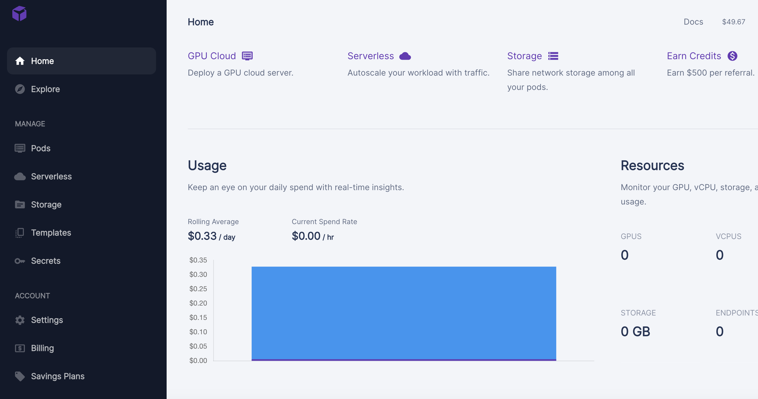 나는 우선 50$를 충전했다.(테스트겸 작은 gpu생성해서 0.33$사용)