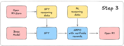 step3는 SFT와 GRPO를 반복해서 R1을 만드는것처럼, SFT/GRPO를 적용하여 Open-R1를 재현하는 것이다