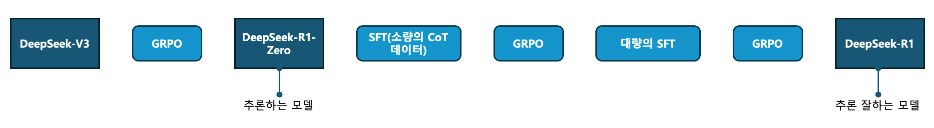소량 SFT > 다시 GRPO(CoT 기반의 추론 능력을 극대화하는 단계) > 대규모 SFT > 다시 GRPO(최종 모델을 다듬고 최적의 상태로 정렬하는 단계)를 거쳐서 비로소 R1이 탄생하게 된다.