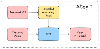 step1은 DeepSeek-R1을 통해서 추론데이터를 생성한 후, 이 데이터로 지식증류 모델을 만드는 것이다.